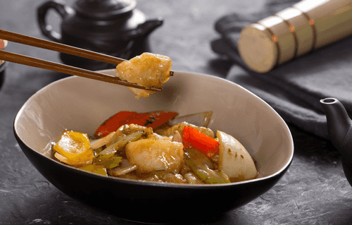 Fried small-eyed macrurus with vegetables is an exquisite dish of Pan-Asian cuisine that captivates with its rich flavor and texture. Macrurus, known for its tender flesh and thin skin, acquires a crispy golden crust thanks to being breaded in starch. The vegetables stir-fried over high heat retain their freshness and flavor intensity, while the oyster sauce adds pleasant depth to the dish. A light tang from lemon juice balances the richness, making each bite particularly appetizing. This dish pairs perfectly with rice or noodles, highlighting the harmony of Pan-Asian flavors. It should be served immediately after cooking to maintain the contrast between the crispy fish and juicy vegetables. An excellent choice for those who appreciate rich flavor compositions and the aesthetics of Asian gastronomy.