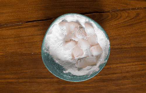 Fillet with skin, previously drained excess water in a colander, dried with a paper towel and cut into pieces about 3x3 cm, leaving the skin. Salted, drizzled with lemon juice and immediately coated all pieces in starch.