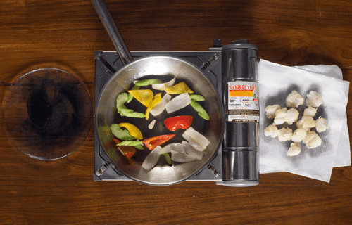 Drain the oil, leaving a small amount for frying the vegetables. You can use a fresh pan. Quickly fry the vegetables and garlic for 30-40 seconds on very high heat.