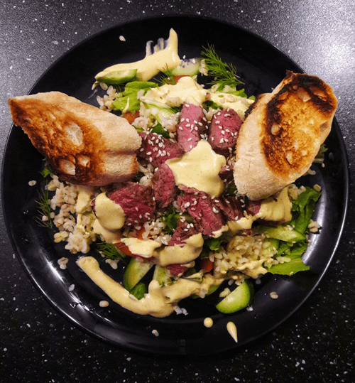 Slice the steak crosswise into pieces of 5–7 cm. Place on bulgur. At the end, drizzle sauce to taste. Also drizzle sauce on the edges of the plate for dipping the meat. Sweet mustard sauce pairs excellently.