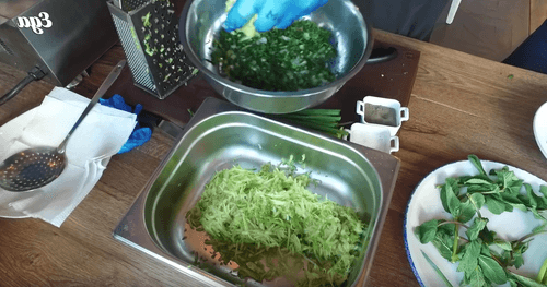 Chop the onion and herbs, add to the grated zucchini. Season with salt and pepper to taste.