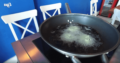 Pour vegetable oil into the pan and heat it. Form round patties with wet hands and fry them in hot vegetable oil.