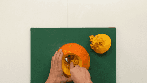 Wash the pumpkin, cut off the top, and clean out all the seeds and fibers.