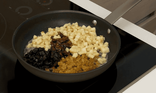 In the same pan, heat 20 grams of butter and sauté the peeled and diced apple with the prepared dried fruits for 2-3 minutes.