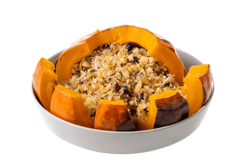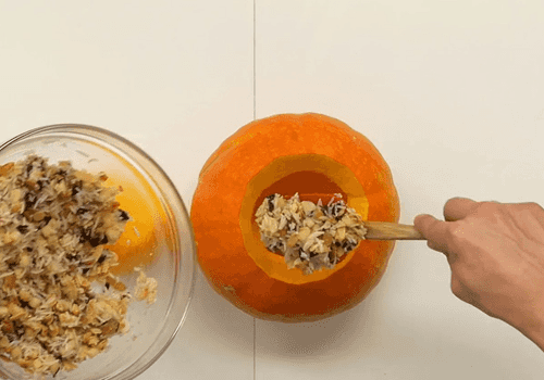 Transfer the filling into the pumpkin. The filling will increase during cooking, so do not fill the pumpkin to the brim.