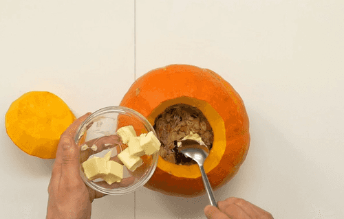 Place pieces of butter on top and cover with a pumpkin lid.