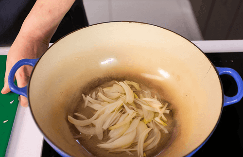 Slice one onion into half rings. Take a pot or a thick-bottomed pan, preferably a kazan. Place it on the stove, turn on the maximum heat and pour in sunflower oil generously to cover the bottom by a couple of millimeters. Add the onion to the hot oil, reduce the heat to medium and fry until golden.