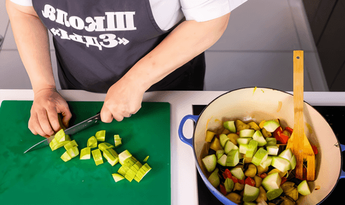 Cut off the ends of the eggplants. Cut the eggplants in half, then cut each half in half again. Cut each quarter into large pieces and place them in a pot. Do not remove the skin from the eggplant; otherwise, it will turn into mush. Eggplant is a grateful product; it absorbs the flavors of all neighboring ingredients. Stir the vegetables in the pot every two minutes.