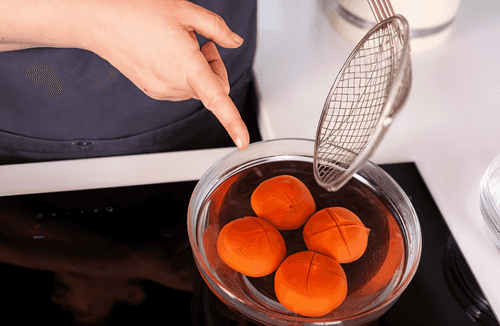 Take the tomatoes. It's better to peel them beforehand. Make cross cuts on the tomatoes, blanch them in boiling water and leave for two minutes. After two minutes, immerse them in ice water, or even better in a bowl with ice. Then peel the skin off. Cut the tomatoes in half. Cut the tomatoes into four wedges, then cut each wedge in half again. Place the tomatoes in a pot and immediately add sugar to it. Cover the pot with a lid.
