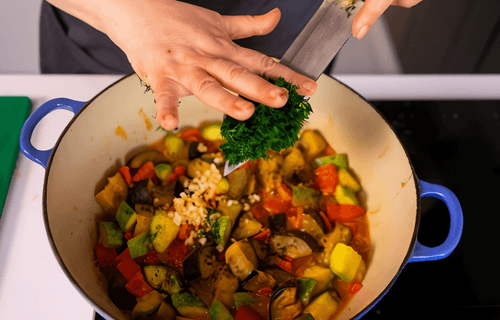 Овощное рагу с сезонными овощами – это блюдо, пропитанное духом традиционной европейской кухни. Оно дарит ароматное буйство свежих овощей, соединенных в гармоничный ансамбль вкусов. Легкая сладость болгарского перца, нежность кабачков и насыщенность баклажанов создают сбалансированный и яркий вкус, дополненный легкими нотками укропа и чеснока. Томаты придают блюду приятную кислинку и насыщенный цвет, а небольшой штрих сахара раскрывает вкус еще глубже. Этот рецепт – идеальное решение для летнего стола, когда овощи на пике своей свежести. Рагу можно подавать как самостоятельное блюдо или использовать как гарнир к мясу или рыбе. Оно согревает в прохладные вечера и освежает в жаркие дни, оставаясь легким, питательным и невероятно вкусным.