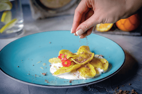 Yellow dumplings with spicy sweet potato are a culinary journey into Russian cuisine with an exotic touch. Thanks to turmeric, the dough takes on a sunny color, while the filling of sweet potato with orange zest and spices offers tenderness and spicy warmth. The origins of such dumplings trace back to traditional Russian dishes, but the use of sweet potato adds a fresh perspective to the classic. Its sweet flavor combined with nutmeg and cinnamon creates a harmonious composition reminiscent of cozy winter evenings. These dumplings are perfect for festive dinners or cozy family tea times. They are delicious both hot and slightly cooled, and adding sour cream or sweet sauce turns them into a true delicacy. The unusual hue of the dough makes the dish even more appealing, enticing guests to try and enjoy every bite.