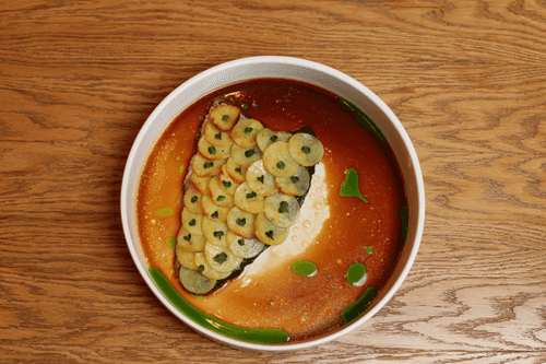 Send everything to the oven preheated to 180 degrees for 25 minutes. When serving, drizzle with sauce and add green oil. Garnish the fish with herbs.