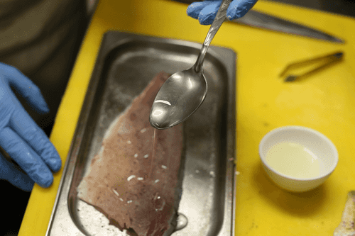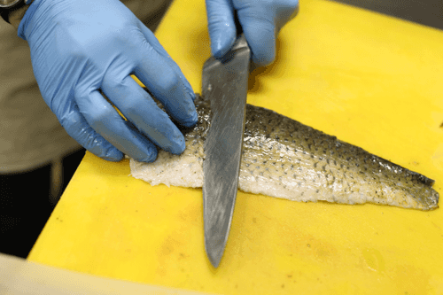 Make cuts on the skin side of the fillet with a knife — this is necessary so that during cooking, the skin does not pull the meat and the surface remains flat.