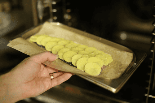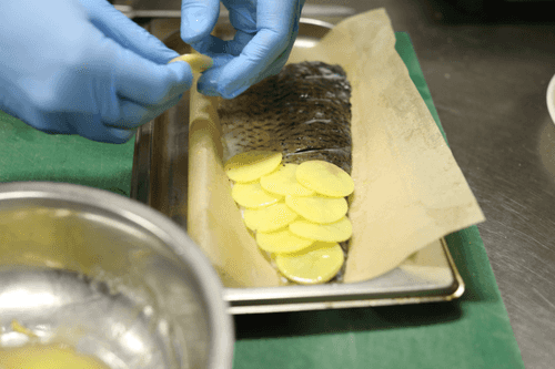 Slice the potatoes into thin slices. Use a metal ring to cut out circles from each slice. The leftover potatoes can be used for mashed potatoes or soup. Place the circles on the fish to mimic scales. Brush with melted butter.