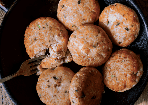 Make a longitudinal cut, place cod liver inside, seal the edges, and roll into a patty.