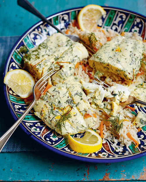 Place the rice on a large plate and drizzle with lemon juice. Top with fish and pour sauce over it.