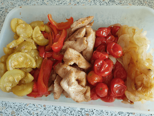 Chicken baked with zucchini, cherry tomatoes and pepper
