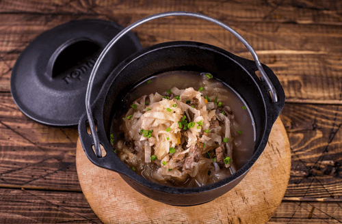 Cabbage stewed in a cast iron pot