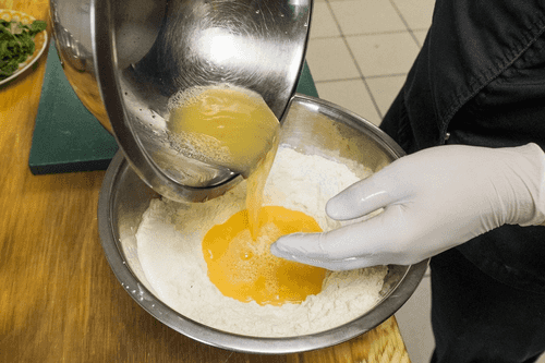 Pour the flour into a bowl in a mound, make a well in the center, and add 10 grams of salt to the center. In a separate bowl, pour in 180 ml of room temperature water, add 10 grams of salt and crack in the eggs, mixing well. Carefully pour this liquid into the well in the dough and start mixing with your hands.