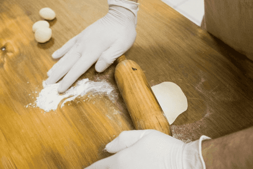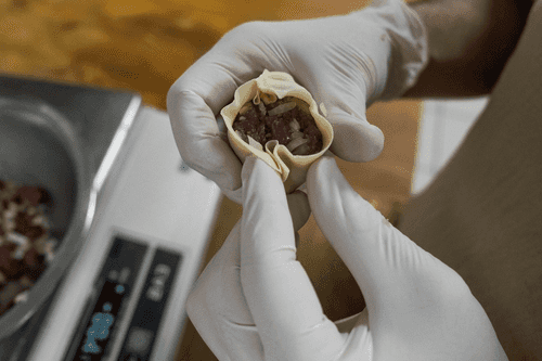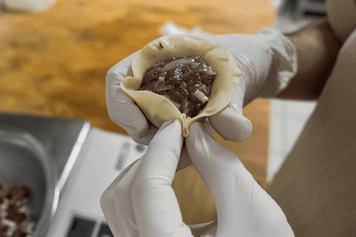 Then take the circles and shake them well to remove excess flour. Place the circle on your fist so that the center of the circle is on your thumb. Make a small indentation in the dough, put 45 grams of filling there, and press the filling inside well to keep the edges of the dough relatively clean.