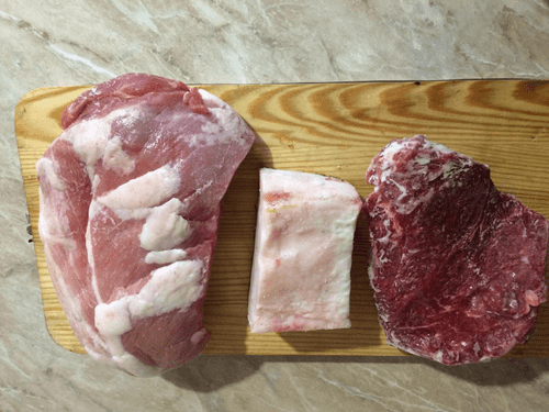 Prepare all ingredients. The meat should be at room temperature. Clean and rinse the pig intestines in a saline solution. Cut the meat and fat into small cubes about 1 cm on each side.