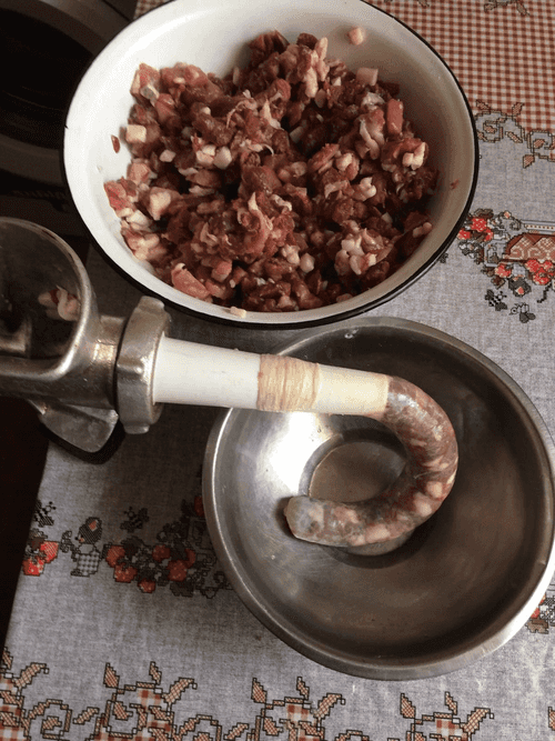 Put the pig intestine on the special attachment of the meat grinder. Leave only one auger in the grinder, do not install the plate and knife. Tie the end of the intestine with a thread and gradually fill it with chopped mass. Divide the intestine into desired sausage sizes, tying both ends with thread.