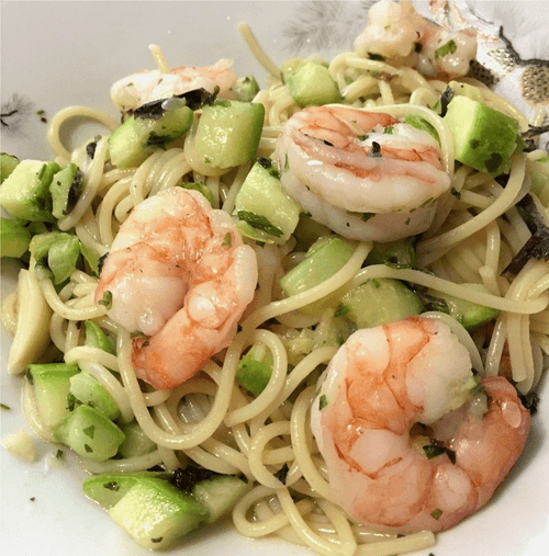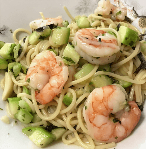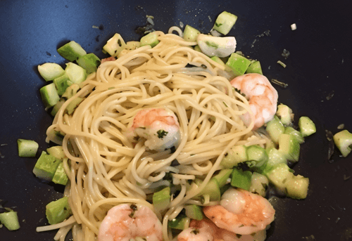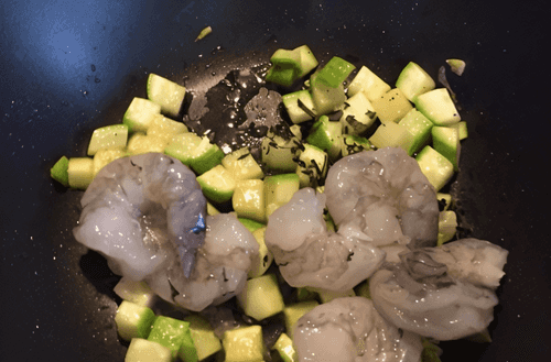 Once the zucchini is fried, add shrimp and dried basil. Season with salt and pepper. Fry for 3 minutes if the shrimp are fresh and 5 minutes if they are frozen.