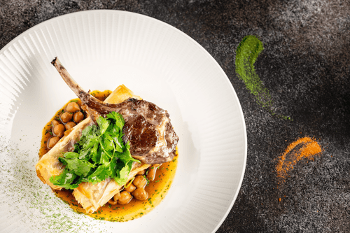 Place the side dish in deep plates (100 grams per serving), then top each plate with 2 pastries. Optionally garnish with a segment of grilled lamb rack.