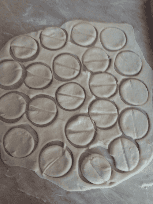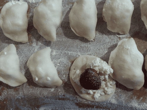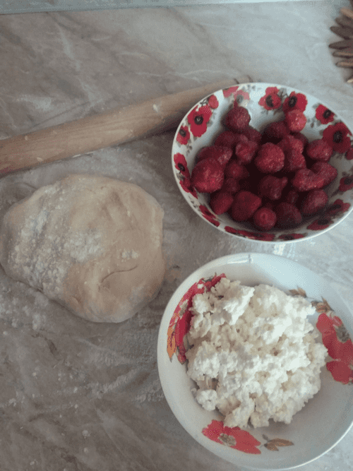 Place 1 teaspoon of cottage cheese and 1-2 strawberries on the dough. Shape the dumplings.
