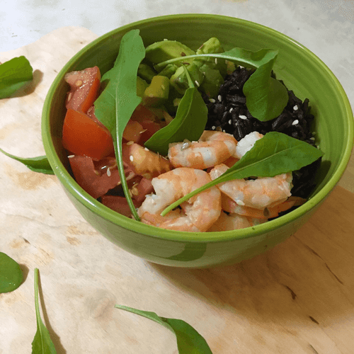 Bowl with shrimp, avocado and black rice