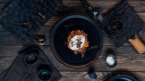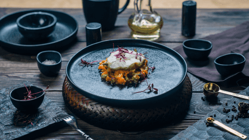 Present the dish beautifully: mix the cooked vegetables and place them on a plate. Top with the baked steak and garnish with greens.