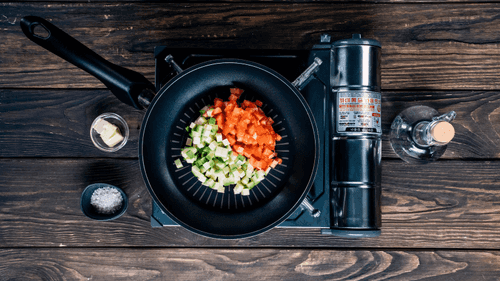 Chop the vegetables into small cubes, salt them, place in a pan and cover with water (the water should cover the vegetables). Then add butter and put on high heat. Cook until the water completely evaporates. At the very end, add garlic to the pan. By the time the vegetables are ready, the steak will be baked in the oven.