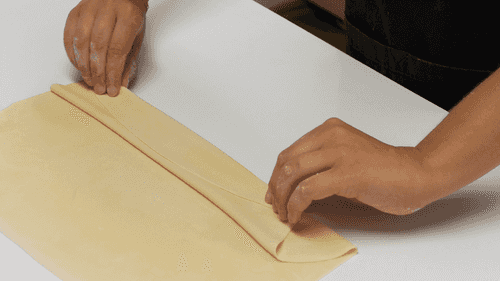 On a floured surface, roll out the dough to a thickness of about one millimeter. Cut it into strips 5 cm wide, then stack the strips on top of each other and cut them into squares.