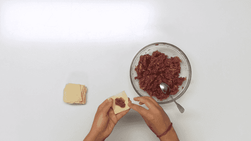 Place a little filling on the dough, slightly less than a teaspoon, seal the edges, and then pinch the corners together. Do this with all the dough and filling.