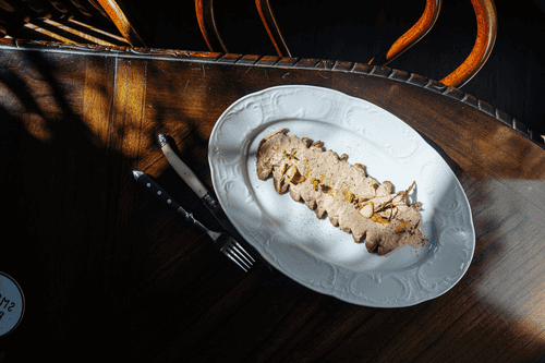 Place the meat on a plate like carpaccio, then generously spread the sauce, add a bit of olive oil, a pinch of freshly ground pepper, and top with garlic and rosemary used to sauté the meat.