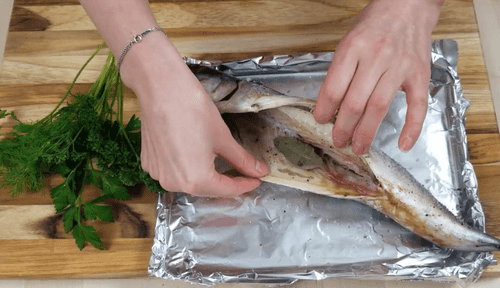 Place the fish on a baking tray and cover it with aluminum foil. Make 4-5 holes for steam to escape.