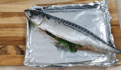 Bake mackerel in a preheated oven at 220 degrees for 20 minutes. Then remove the top foil and bake for another 4-5 minutes.