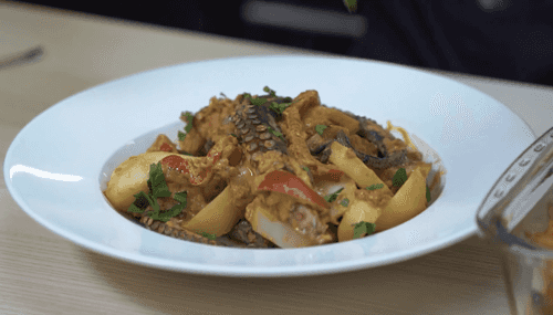 Octopus in tomato sauce is a gourmet dish of Mediterranean cuisine, embodying the traditions and flavors of the seaside. The tender tentacles of the octopus, subjected to prolonged cooking, become soft and infused with the aromas of spicy tomato sauce. The rich flavor palette unfolds thanks to the combination of sweet tomatoes, pungent garlic, and a hint of lemon juice's acidity. Chili pepper adds a lively spiciness to the dish, while cream makes the sauce's texture more velvety. Potatoes baked in the tomato mixture absorb flavor nuances and become a magnificent side dish. This dish pairs perfectly with a glass of white wine and fresh herbs, transforming into a true gastronomic delight worthy of a festive dinner or cozy family evening.