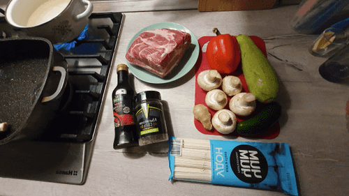 Udon noodles with pork and vegetables is a true embodiment of Pan-Asian cuisine, combining the rich flavor of meat with the delicate texture of noodles and the freshness of vegetables. This recipe reflects the harmony of Eastern culinary traditions where each ingredient plays its role: mushrooms add depth of flavor, zucchini brings lightness, and ginger adds a spicy note. Peppers and cucumbers add freshness and a slight crunch that highlights the contrast of textures. Soy sauce unites all components to create a rich, balanced taste. Historically, udon became popular in Japan due to its versatility and ability to absorb the flavors of sauces and spices, making it ideal for creating dishes with meat and vegetables. It is best served hot, sprinkled with sesame seeds that add extra aroma and a light nutty note.