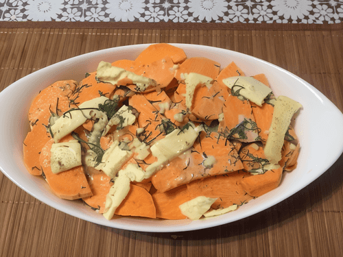 Grease the form with a piece of butter. Then layer the potatoes and sweet potatoes. Once half of the layers are laid down, salt, pepper, and place pieces of butter on top. Then add the next layer, salt and pepper again, and place pieces of butter.