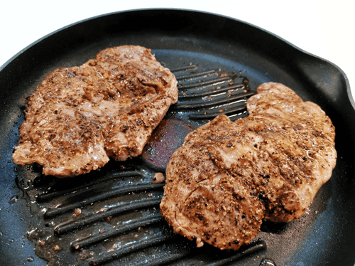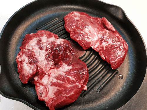 Place the meat seasoned side down on the hot skillet.