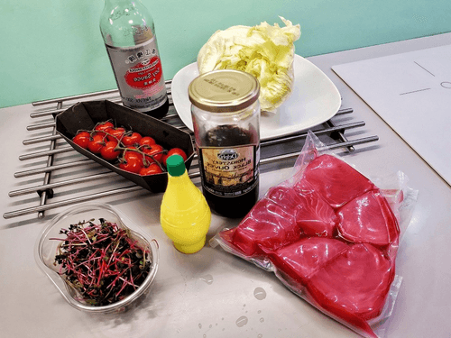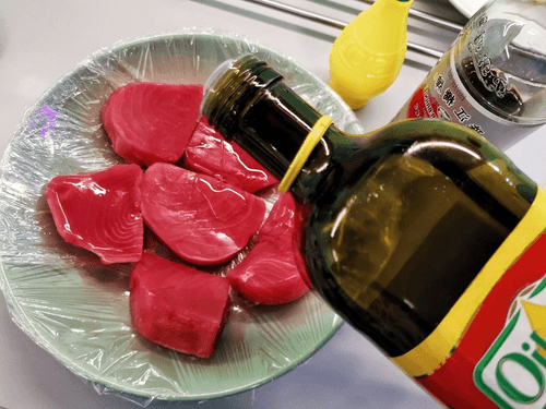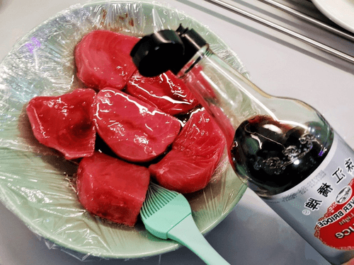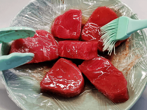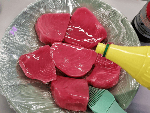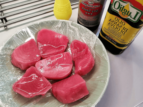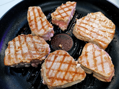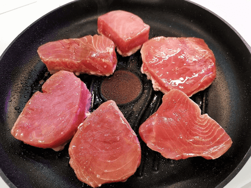 Place the tuna on a hot grill pan and reduce the heat to medium, cooking for about 2-3 minutes.