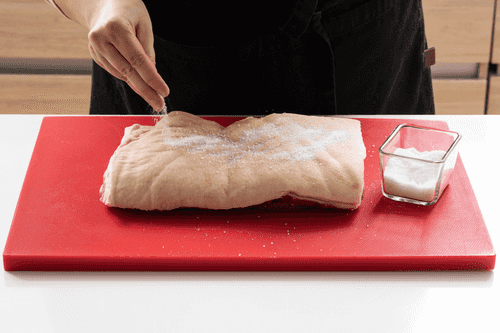 Rub the pork belly well with salt on the skin side and leave it in the fridge overnight, uncovered.