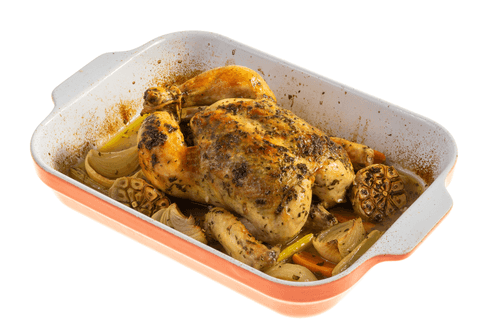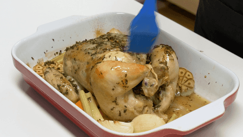 Place the chicken in a baking dish, add halved garlic, onion, carrot, and celery next to it, and pour in the wine. Put it in an oven preheated to 180 degrees for 45 minutes.