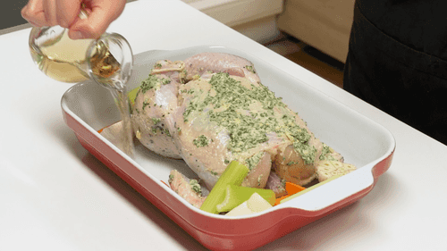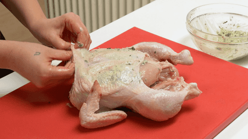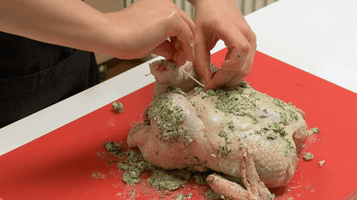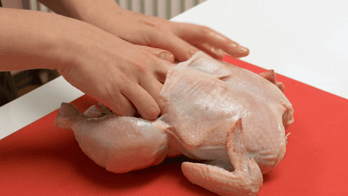 Tie the legs with culinary thread and wrap the wings behind the back.