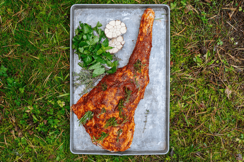 Make cuts in the shoulder and stuff with sprigs of fresh rosemary and thyme - the lamb loves their piney tones.