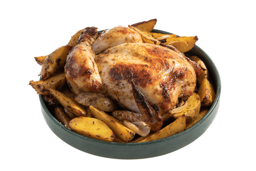 Place the cooked chicken on the baked potatoes so that the juices from the chicken enrich the flavor of the vegetables.