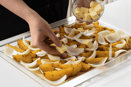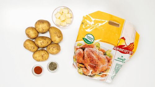 Place onions and potatoes on a baking sheet, randomly scatter pieces of butter on top. Send the baking sheet with potatoes to the oven next to the chicken for 30-40 minutes.