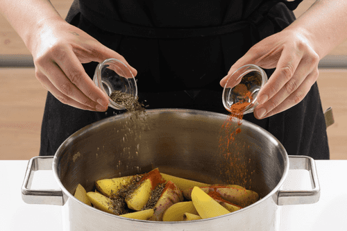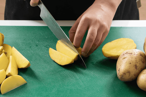 Cut the potatoes into equal-sized wedges.