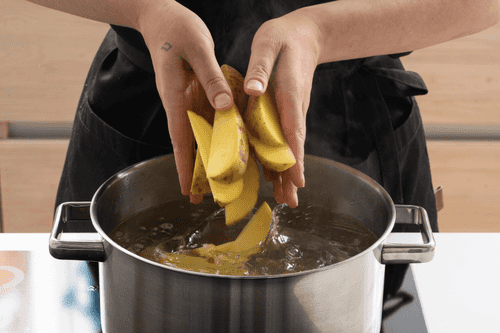 Boil water in a pot, add salt, throw in the potatoes and cook for 3 minutes.